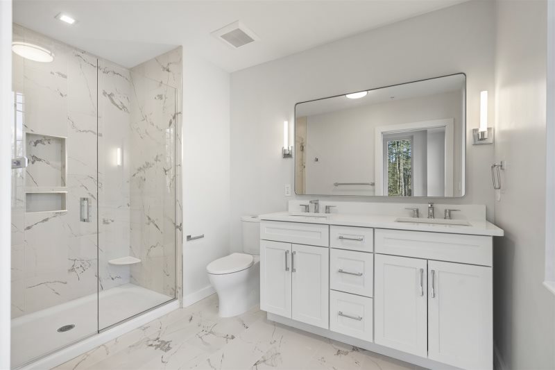 Bed & Bath: There are two bedrooms; the primary with an en suite full bath including an oversized glass shower. Both bathrooms are decorated in spa-like marble with make-up lighting, and ample storage.